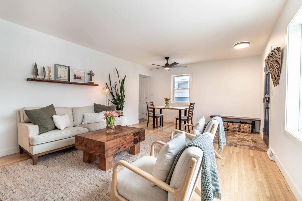 Natural light and beautiful hardwood floors welcome you into this impeccably cared for home. The kitchen includes an eat-in area, both bathrooms feature tile surrounds, and a finished bonus room provides flexibility for a future third bedroom, office, or guest space. Updated windows, a modern gas furnace and central air, and a large fully fenced yard complete the home.